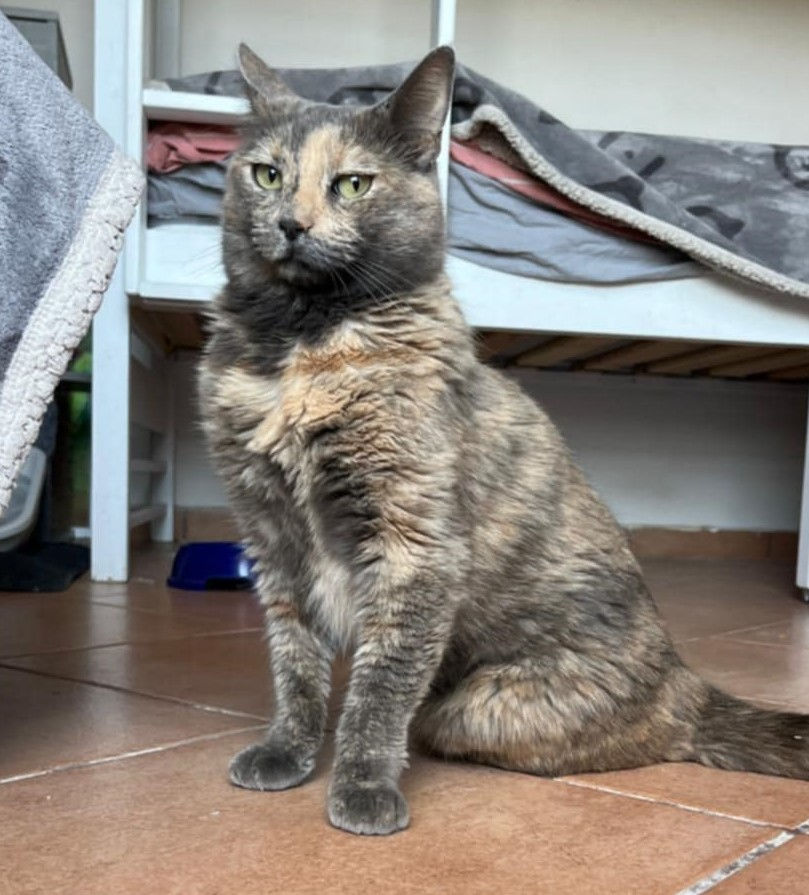Now I’m hoping for another chance to find someone special who’ll love me again. The humans here take good care of me. I don’t need any treatment, I’ve had my vaccines, I’m spayed and healthy, except for my wobbly back legs — they make me walk a little funny, but they don’t bother me much. I don’t take any medicine, and I love my Royal Canin Sensible food. I’m a shy girl, especially around strangers, but if you’re kind and patient, I’ll show you my heart. I give head butts and tiny chirps to the people I trust. I get along with other cats and have two friends here — Handsome and Cato — but I don’t need a busy household. I prefer calm spaces, soft voices, and people who understand that I need time to feel safe.